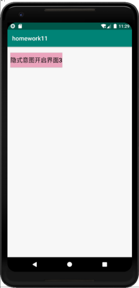 <LinearLayout xmlns:android="http://schemas.android.com/apk/res/android" xmlns:app="http://schemas.android.com/apk/res-auto" xmlns:tools="http://schemas.android.com/tools" android:layout_width="match_parent" android:layout_height="match_parent" android:orientation="vertical" tools:context=".Main2Activity"> <Button android:id="@+id/bt_2" android:layout_width="wrap_content" android:layout_height="wrap_content" android:background="#EEA6BF" android:text="隐式意图开启界面3" android:textSize="20sp" android:textColor="#000000" android:layout_marginLeft="10dp" android:layout_marginTop="20dp"/> </LinearLayout>
