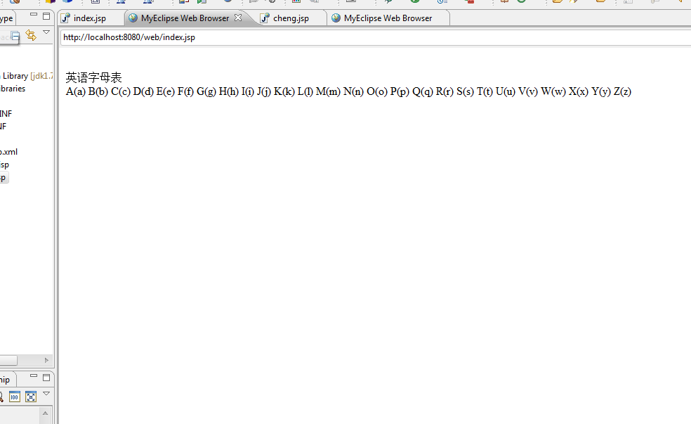 <%@ page language="java" import="java.util.*" pageEncoding="utf-8"%> <% String path = request.getContextPath(); String basePath = request.getScheme()+"://"+request.getServerName()+":"+request.getServerPort()+path+"/"; %> <!DOCTYPE HTML PUBLIC "-//W3C//DTD HTML 4.01 Transitional//EN"> <html> <head> </head> <body> <br>英语字母表 <br> <% for(int i='A';i<='Z';i++){ out.print((char)i+"("+(char)(i+32)+")"+" "); } %> </body> </html>