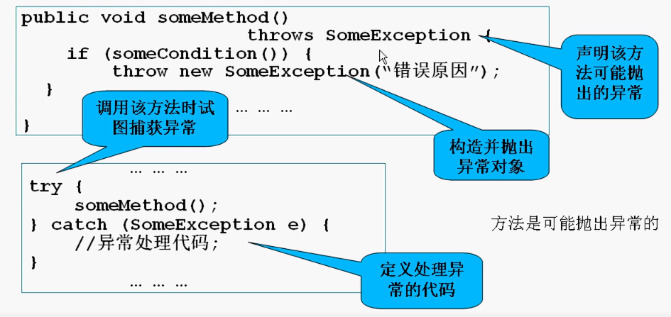 throws语句用在方法声明后面,表示再抛出异常,由调用这个方法的上一级方法中的语句来处理,必须做出处理(捕获或继续声明)