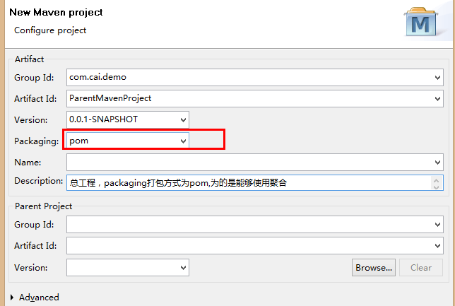 <project xmlns="http://maven.apache.org/POM/4.0.0" xmlns:xsi="http://www.w3.org/2001/XMLSchema-instance" xsi:schemaLocation="http://maven.apache.org/POM/4.0.0 http://maven.apache.org/xsd/maven-4.0.0.xsd"> <modelVersion>4.0.0</modelVersion> <groupId>com.cai.demo</groupId> <artifactId>ParentMavenProject</artifactId> <version>0.0.1-SNAPSHOT</version> <packaging>pom</packaging> <description>总工程,packaging打包方式为pom,为的是能够使用聚合</description> <!-- 在父工程中配置聚合,避免前置工程的install操作,就是说:加入项目mavenProject2依赖于项目mavenProject2,如果 使用依赖的方式,则需要首先将项目mavenProject1安装install到本地仓库中才能供项目mavenProject2使用 --> <modules> <!-- 项目的根路径,就是从pom.xm文件所在的位置回到上一级那个路径, 这里写mavenProject1和mavenProject2的顺序跟安装到本地仓库的顺序无关,主要是看mavenProject1和mavenProject2中的pom.xml之间写的依赖关系
