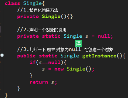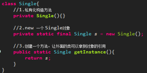 2)既然不让其他程序 new 该类对象,那么该类在自己内部就要创建一个对象,否则该类就永远无法创建对象了。于是做法就是:定义私有静态常量属性(实例化出来的对象),特征为静态是想类在初始化时就加载出来了