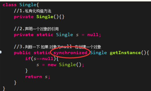 懒汉式有一个缺点,就是在多线程中使用的时候,可能会创建多个实例对象,比如,线程1来调用 getInstance() 方法,判断了 s==null,然后线程1由于未知的原因阻塞了,线程2再来调用 getInstance() 方法,判断 s==null ,线程2就创建了一个对象,这时候线程1又运行了,那么线程1就会创建一个对象~这样就会造成多个对象~
