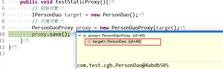 target.savePerson(); // 此处的target的值为com.test.cgb.PersonDao@7ce6a65d,也就是相当这个代理对象操作的是目标对象的方法