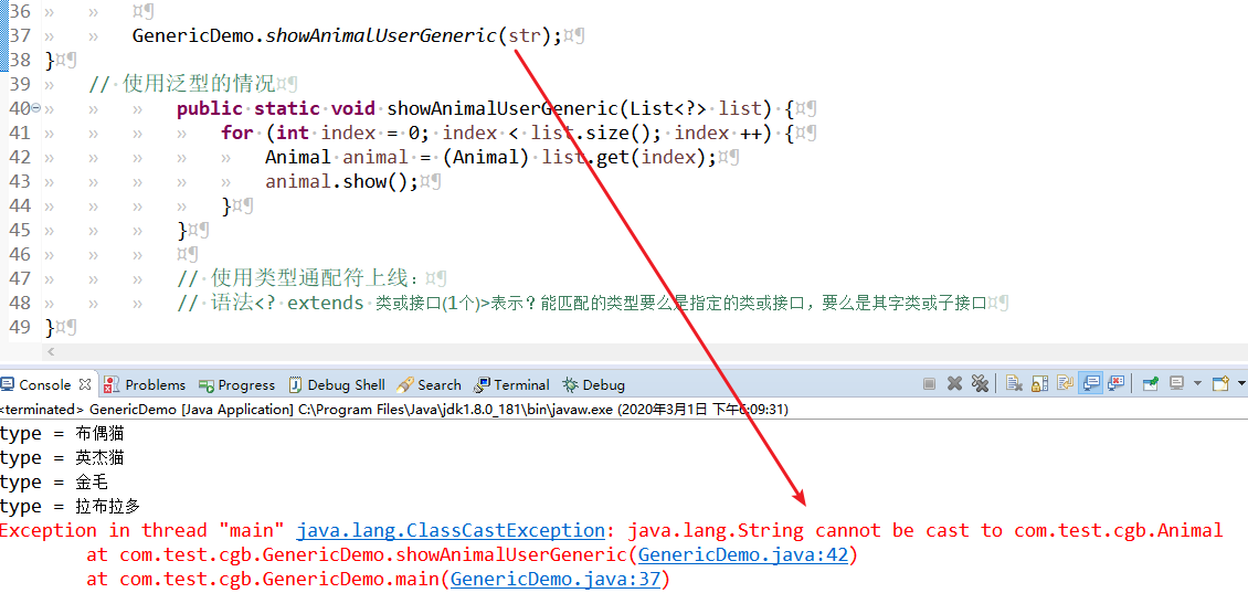 但是单独List<?>还有个缺点就是无法对传入的参数类型进行限制,因为这个showAnimalUserGeneric(List<?> list)方法是可以接收字符串的,这个在编译器是不会报错的,但是在运行期Animal animal = (Animal)list.get(index)时String就会无法转换成Object类型,就会报错的。所以需要使用List<? extends Animal>,这样可以限制参数类型例如没有使用List<? extends Animal>之前是这样的: