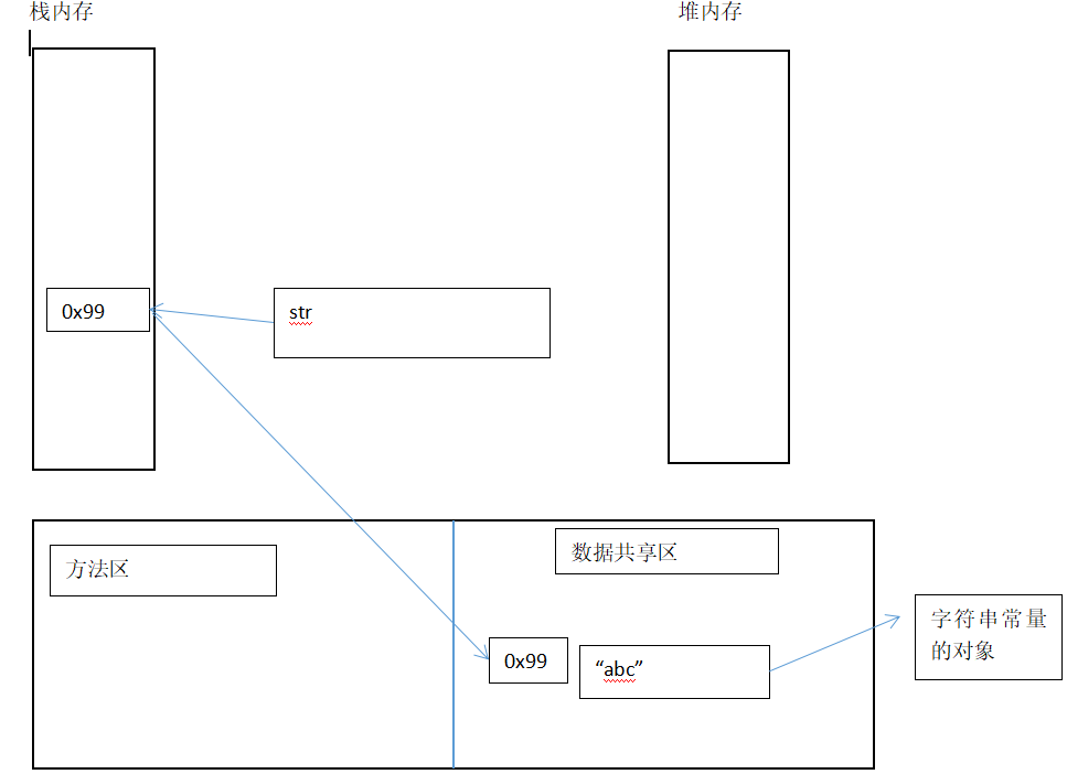 例子:String str = "abc";//这个abc的字符串常量对象的地址一开始为0X99,str变量指向的地址就是0x99.
