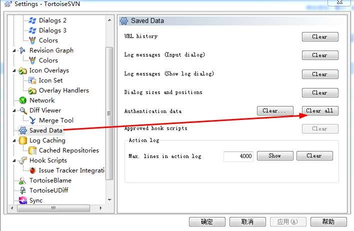 在资源管理器中,右键调出菜单,选择TortoiseSVN->Settings->Saved Data 找到 Authtication Data后面有两个按钮Clear和Clear All,点击Clear All清空自动保存的用户信息。
