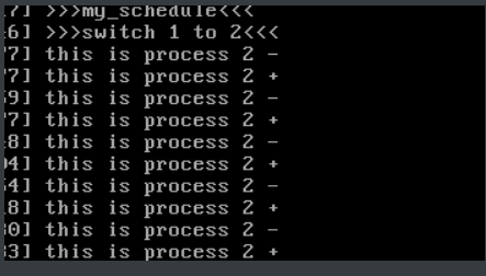 从孟宁老师的github上获取实现进程切换最为重要的三个代码:mymain.c,myinterrupt.c和mypcb.h。随后将原先代码替换为上述三个代码,可以从下面两个图可以明显看出进程的切换。