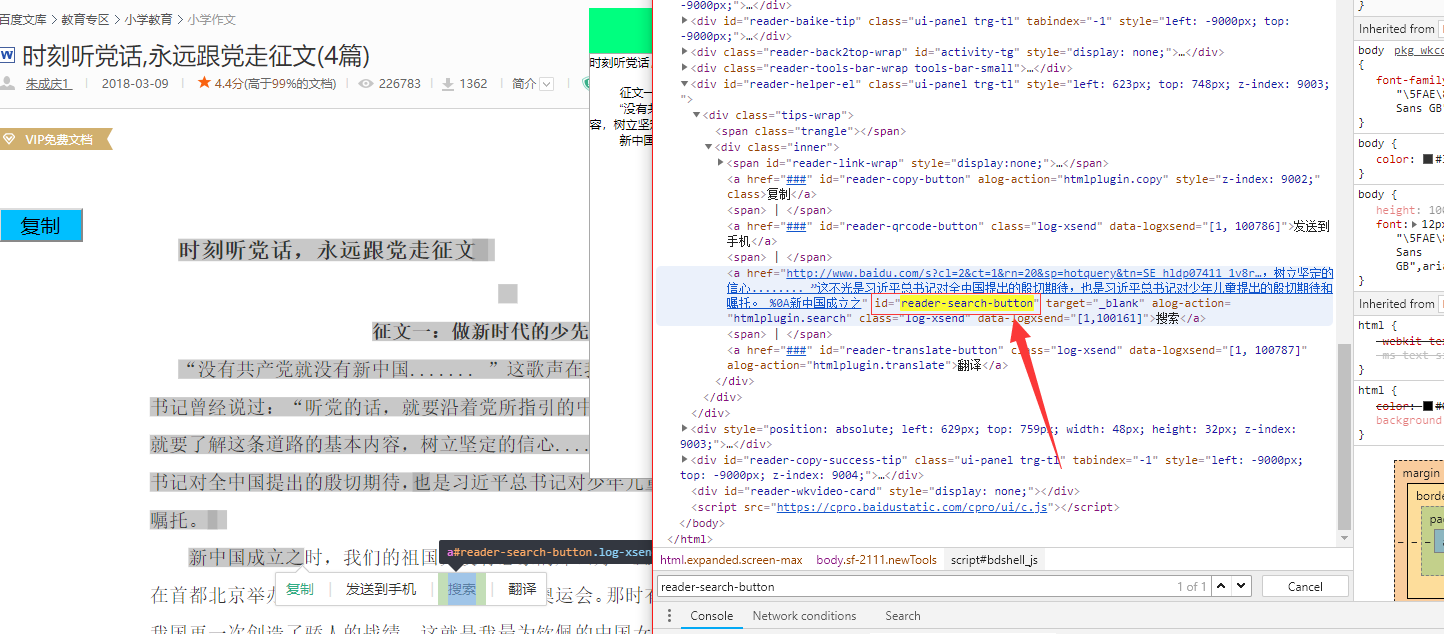 发现一个可利用的点,复制的 文字 都会在 一个 id为 reader-search-button 的a标签中,以参数的形式附在href中。