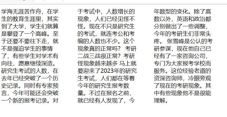 div { -moz-column-count: 3; -webkit-column-count: 3; /* 列数 */ column-count: 3; -moz-column-gap: 40px; -webkit-column-gap: 40px; /* 列间隔的宽度 */ column-gap: 40px; /* */ width: 600px; }