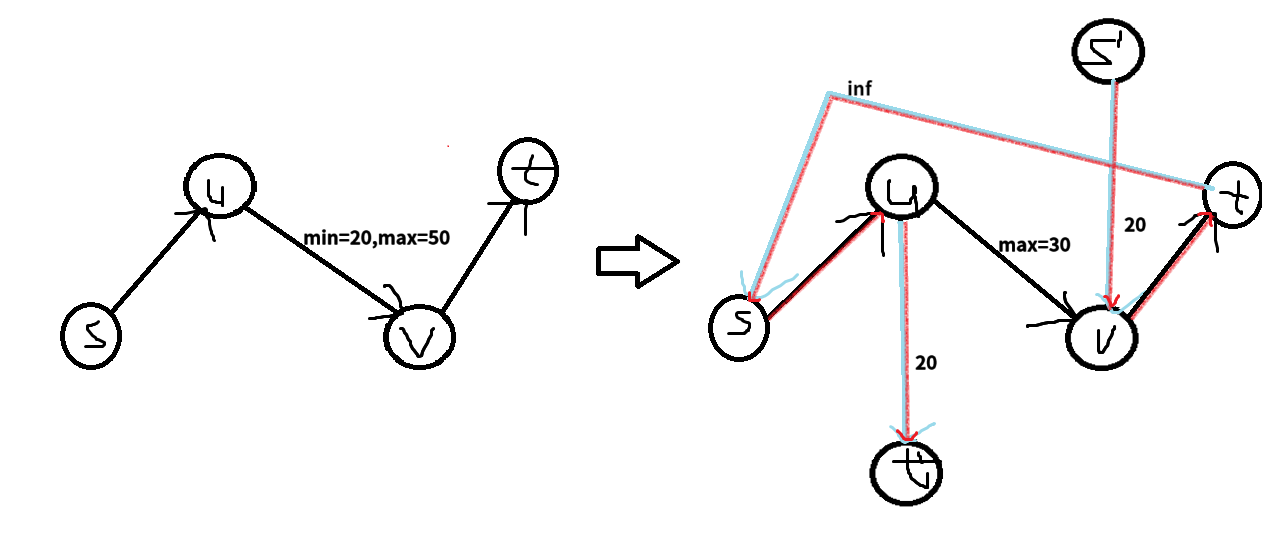 左边是原图,右边添加了 \(s', t'\) 的虚拟源点和浅蓝色的流量平衡边,以及红色的一条使 \(u\to v\) 流满 \(20\) 流量的流。
