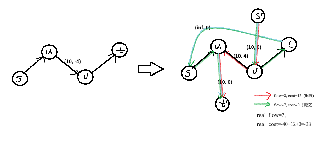 对于一条费用为负的边 \((u, v, f, c)\)(\(f\) 为流量上界,\(c\) 为费用),将其改为一条强制满流的边 \((u, v, f, c)\)(并提前计算它的费用但不计算流量)和一条正常边 \((v, u, f, -c)\)(是原来边的反悔边)。其中,对于强制满流的那条边,使用上下界技术解决。但是在这里有一点不同,第一次跑的可行流得到的流量是强制满流的流量,但是实际上根据我们的建图实际含义,这些流量不是实打实流过去的,有一部分退回的流量通过反悔边送到虚拟汇点,这些流量需要被减去,真实的流量应该是 \(t\) 到 \(s\) 的无穷边的流量。后面的事情都是一样的。