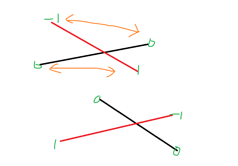按斜率排序后枚举底边。维护关于某条直线距离单调的集合。当 \(l_1k<AB_k<l_2k\) 时,当 \(l_1\) 换到 \(l_2\),需要 swap(a,b)。就是说这样换: