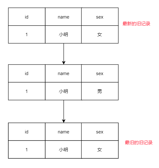undo log 会形成一个链表,链首是最新的旧记录,链尾是最旧的旧记录。如下图