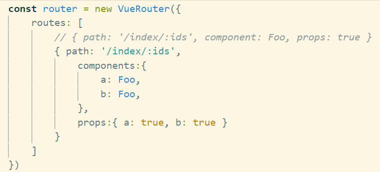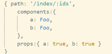 const User = { props: ['id'], template: '<div>User {{ id }}</div>' } const router = new VueRouter({ routes: [ { path: '/user/:id', component: User, props: true }, // 对于包含命名视图的路由,你必须分别为每个命名视图添加 `props` 选项: { path: '/user/:id', components: { default: User, sidebar: Sidebar }, props: { default: true, sidebar: false } } ] })
