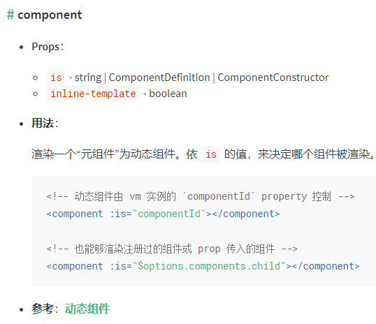 <!-- 组件会在 `currentTabComponent` 改变时改变 --> <component v-bind:is="currentTabComponent"></component>