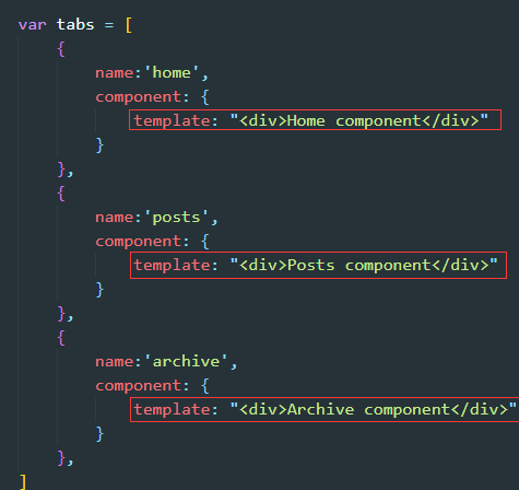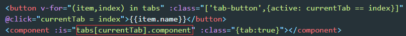 <button v-for="(item,index) in tabs" :class="['tab-button',{active: currentTab === item}]" @click="currentTab = tabs[index]">{{item}}</button> <component :is="componentName" class="tab"></component>