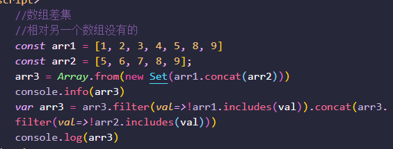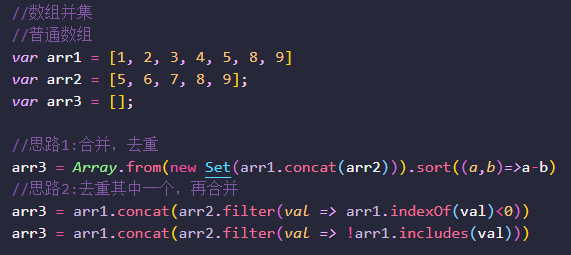 //数组并集 var arr1 = [1, 2, 3, 4, 5, 8, 9] var arr2 = [5, 6, 7, 8, 9]; var arr3 = []; //思路:合并,去重 arr3 =new Set(arr1.concat(arr2)) //下面两个知识点把数据转化成数组 console.log(Array.from(arr3)) console.log([...arr3])