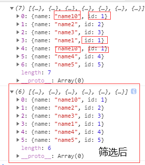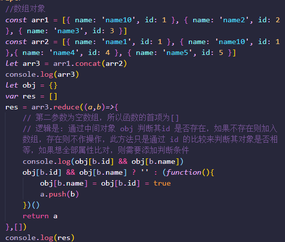 //数组对象 const arr1 = [{ name: 'name1', id: 1 }, { name: 'name2', id: 2 }, { name: 'name3', id: 3 }] const arr2 = [{ name: 'name1', id: 1 }, { name: 'name4', id: 4 }, { name: 'name5', id: 5 }] let arr3 = arr1.concat(arr2) let obj = {} var res = [] res = arr3.reduce((a,b)=>{