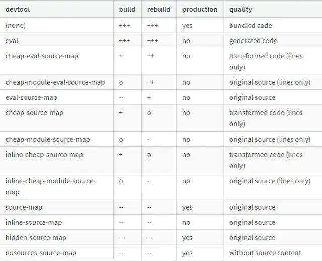 SourceMap 的可选值如下(+ 号越多,代表速度越快,- 号越多,代表速度越慢, o 代表中等速度 )