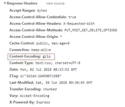 - 重启服务,观察网络面板里面的 response header,如果看到如下红圈里的字段则表明 gzip 开启成功 :