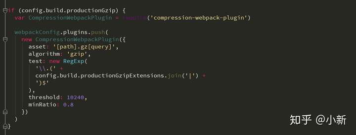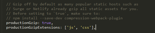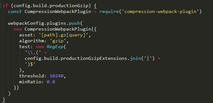 if (config.build.productionGzip) { var CompressionWebpackPlugin = require('compression-webpack-plugin') webpackConfig.plugins.push( new CompressionWebpackPlugin({ asset: '[path].gz[query]', algorithm: 'gzip', test: new RegExp( '\\.(' + config.build.productionGzipExtensions.join('|') + ')$' ), threshold: 10240, minRatio: 0.8 }) ) }