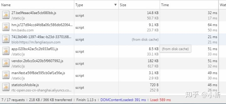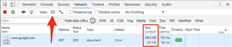 那么怎么看有没有用gzip压缩的文件呢,打开f12,查看network,点击“use large rows”表情来查看更多信息。包含了压缩以后的大小和源文件的大小。