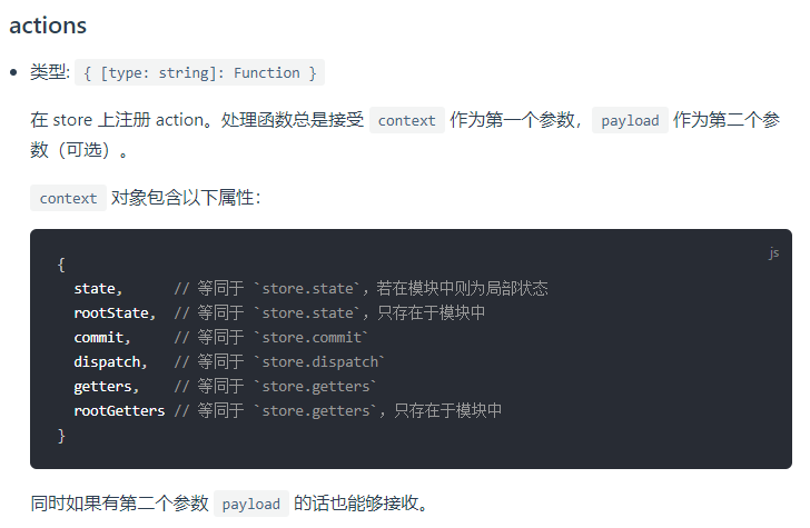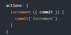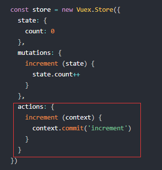 const store = new Vuex.Store({ state: { count: 0 }, mutations: { increment (state) { state.count++ } }, actions: { increment (context) { context.commit('increment') } } })