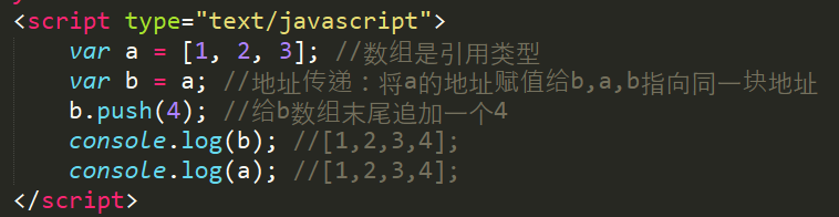 分析:由于a和b都是引用类型,采用的是址传递,即a将地址传递给b,那么a和b必然指向同一个地址(引用类型的地址存放在栈内存中),而这个地址都指向了堆内存中引用类型的值。当b改变了这个值的同时,因为a的地址也指向了这个值,故a的值也跟着变化。