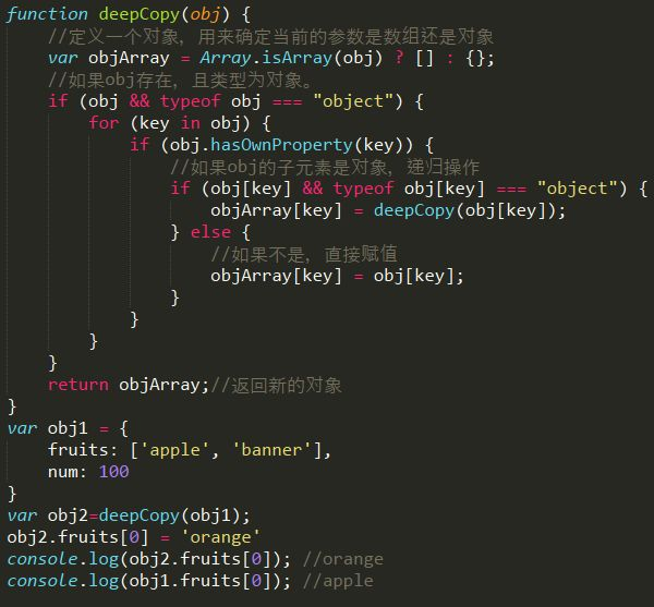 //深拷贝 function deepCopy(obj) { //定义一个对象,用来确定当前的参数是数组还是对象 var objArray = Array.isArray(obj) ? [] : {}; //如果obj存在,且类型为对象 if (obj && typeof obj === "object") { for (key in obj) { if (obj.hasOwnProperty(key)) { //如果obj的子元素是对象,递归操作 if (obj[key] && typeof obj[key] === "object") { objArray[key] = deepCopy(obj[key]); }else{ objArray[key] = obj[key]; } } } } return objArray; }