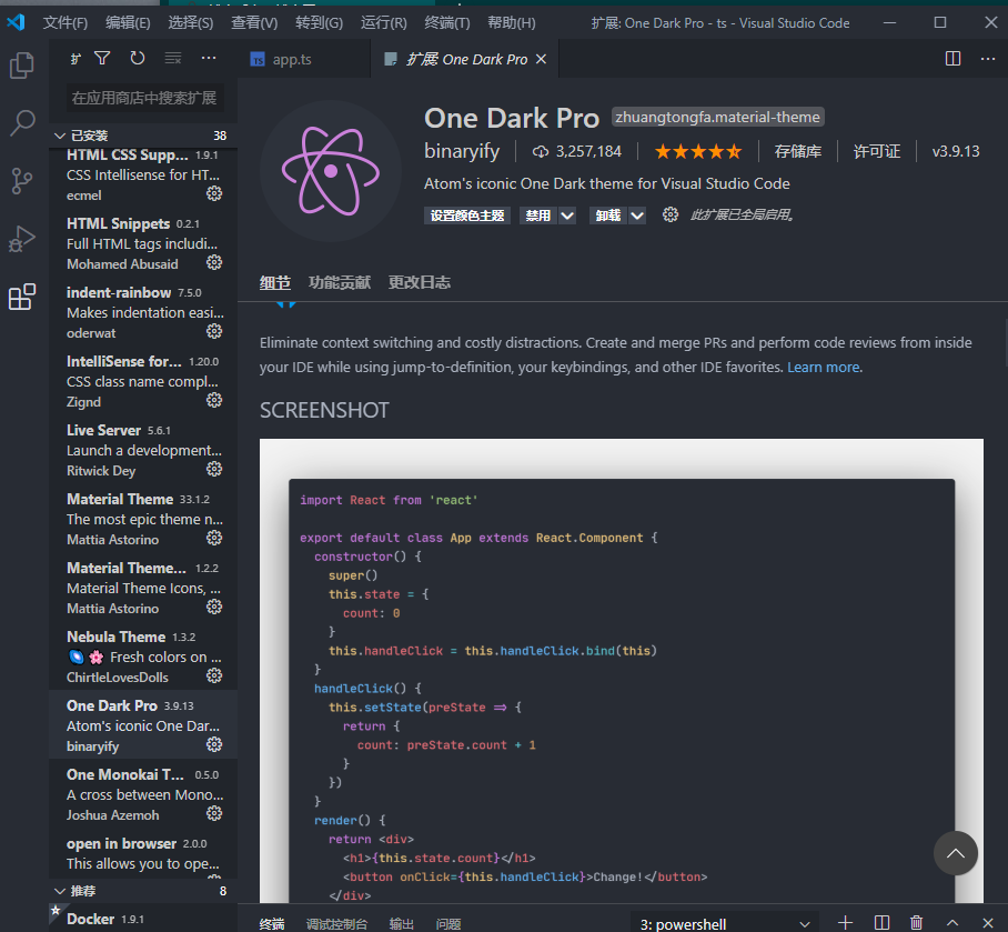One Dark Pro 一个很舒服的暗色背景,它属于那种柔和暗的那种