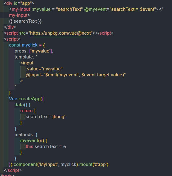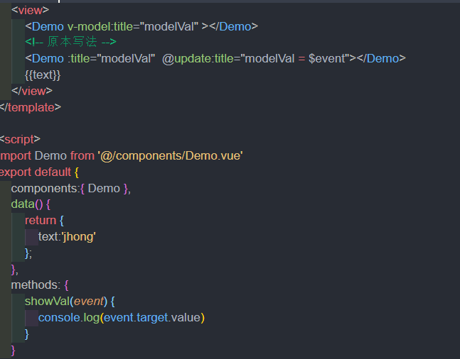 <ChildComponent v-model:title="pageTitle" v-model:content="pageContent" /> <!-- 是以下的简写: --> <ChildComponent :title="pageTitle" @update:title="pageTitle = $event" :content="pageContent" @update:content="pageContent = $event" />