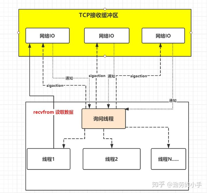 正如上图,IO复用模型的思路就是系统提供了一种函数可以同时监控多个fd的操作,这个函数就是我们常说到的select、poll、epoll函数,有了这个函数后,应用线程通过调用select函数就可以同时监控多个fd,select函数监控的fd中只要有任何一个数据状态准备就绪了,select函数就会返回可读状态,这时询问线程再去通知处理数据的线程,对应线程此时再发起recvfrom请求去读取数据。
