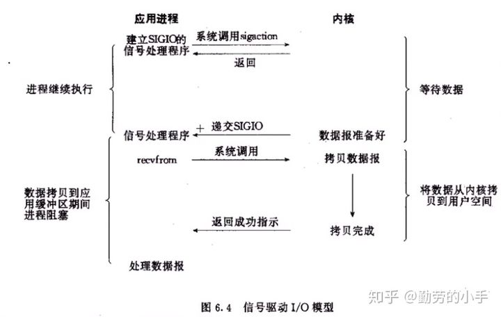 术语描述:首先开启套接口信号驱动IO功能,并通过系统调用sigaction执行一个信号处理函数,此时请求即刻返回,当数据准备就绪时,就生成对应进程的SIGIO信号,通过信号回调通知应用线程调用recvfrom来读取数据。