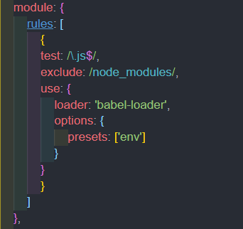 {test: /\.js$/, use: 'babel-loader', exclude: /node_modules/}