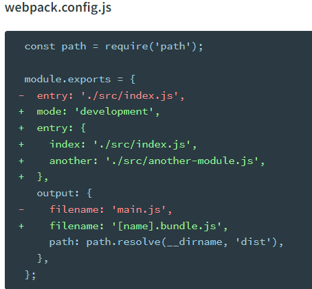 const path = require('path'); module.exports = { mode: 'development', entry: { index: './src/index.js', another: './src/another-module.js', index: { import: './src/index.js', dependOn: 'shared', }, another: { import: './src/another-module.js', dependOn: 'shared', }, shared: 'lodash', }, output: { filename: '[name].bundle.js', path: path.resolve(__dirname, 'dist'), }, };