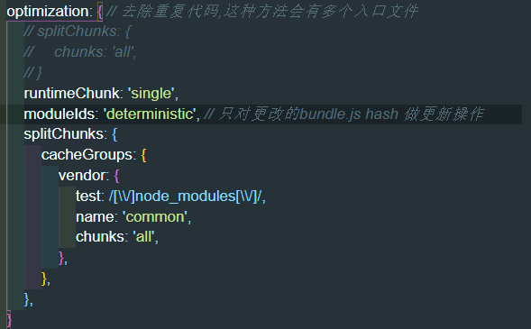 optimization: { runtimeChunk: 'single', splitChunks: { cacheGroups: { vendor: { test: /[\\/]node_modules[\\/]/, name: 'common', chunks: 'all', }, }, }, },
