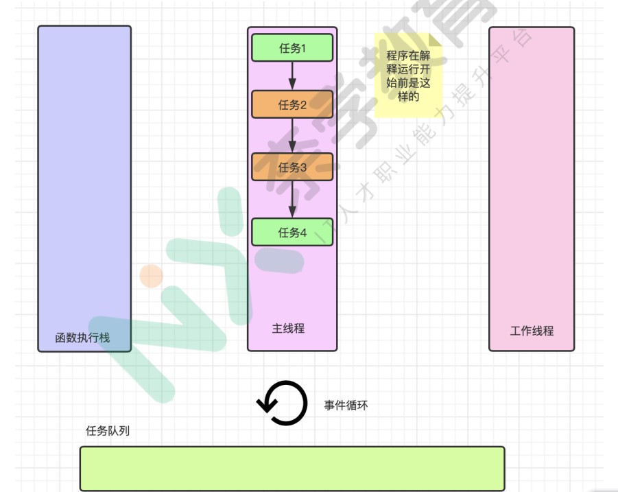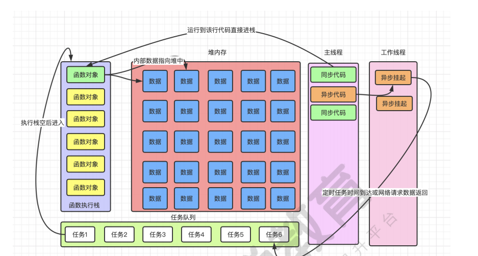 上图是JavaScript运⾏时的⼀个⼯作流程和内存划分的简要描述,我们根据图中可以得知主线程就是我们JavaScript 执⾏代码的线程,主线程代码在运⾏时,会按照同步和异步代码将其分成两个去处,如果是同步代码执⾏,就会直 接将该任务放在⼀个叫做“函数执⾏栈”的空间进⾏执⾏,执⾏栈是典型的【栈结构】(先进后出),程序在运⾏的 时候会将同步代码按顺序⼊栈,将异步代码放到【⼯作线程】中暂时挂起,【⼯作线程】中保存的是定时任务函 数、JS的交互事件、JS的⽹络请求等耗时操作。当【主线程】将代码块筛选完毕后,进⼊执⾏栈的函数会按照从外 到内的顺序依次运⾏,运⾏中涉及到的对象数据是在堆内存中进⾏保存和管理的。【1】(知识点,深浅拷贝,基本数据类型和引用数据类型)当执⾏栈内的任务全部执⾏完毕 后,执⾏栈就会清空。执⾏栈清空后,“事件循环”就会⼯作,“事件循环”会检测【任务队列】中是否有要执⾏的任 务,那么这个任务队列的任务来源就是⼯作线程,程序运⾏期间,⼯作线程会把到期的定时任务、返回数据的http 任务等【异步任务】按照先后顺序插⼊到【任务队列】中,等执⾏栈清空后,事件循环会访问任务队列,将任务队 列中存在的任务,按顺序(先进先出)放在执⾏栈中继续执⾏,直到任务队列清空。