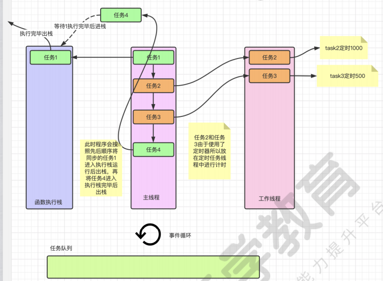 结合上图可以看出程序在主线程执⾏之后就将任务1、4和任务2、3分别放进了两个⽅向,任务1和任务4都是⽴即 执⾏任务所以会按照1->4的顺序进栈出栈(这⾥由于任务1和2是平⾏任务所以会先执⾏任务1的进出栈再执⾏任务 4的进出栈),⽽任务2和任务3由于是异步任务就会进⼊⼯作线程挂起并开始计时,并不影响主线程运⾏,此时的 任务队列还是空置的。
