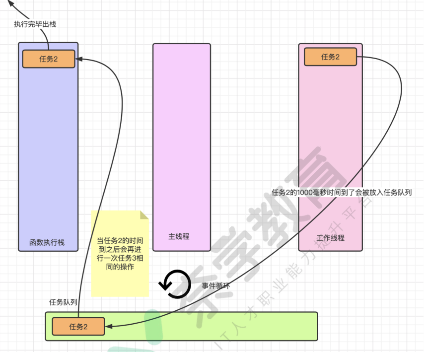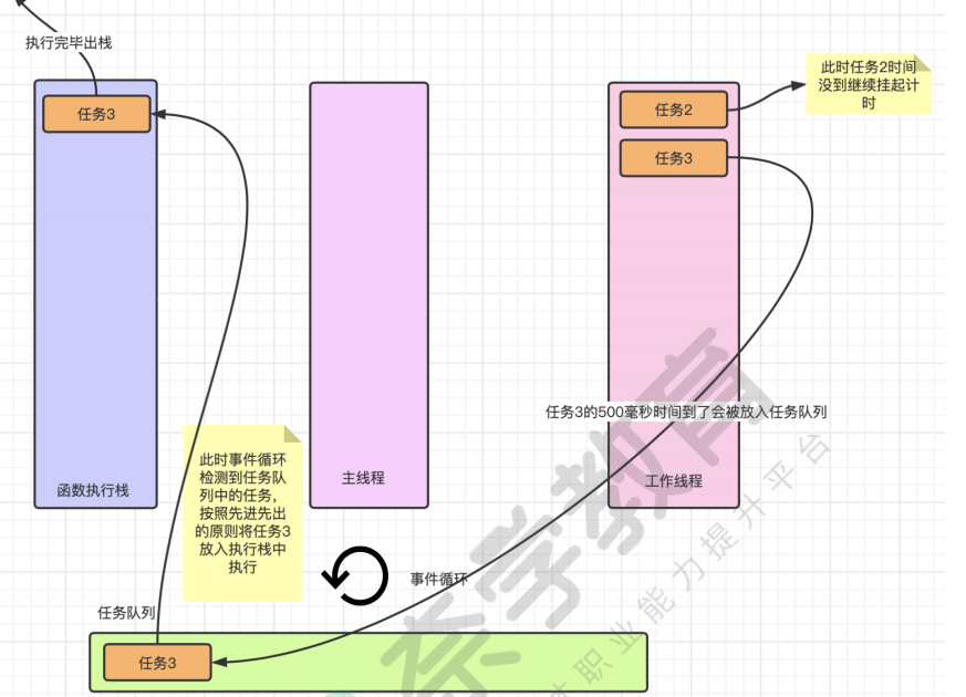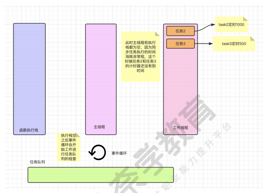 我们发现任务队列并不是⼀下⼦就会将任务2和任务三⼀起放进去,⽽是哪个计时器到时间了哪个放进去,这样我 们的事件循环就会发现队列中的任务,并且将任务拿到执⾏栈中进⾏消费,此时会输出任务3的内容。
