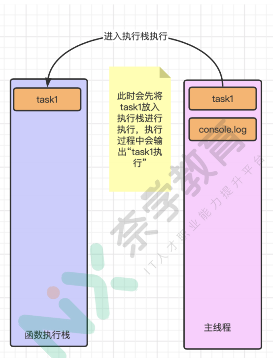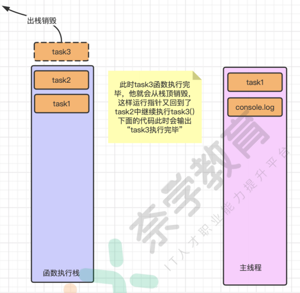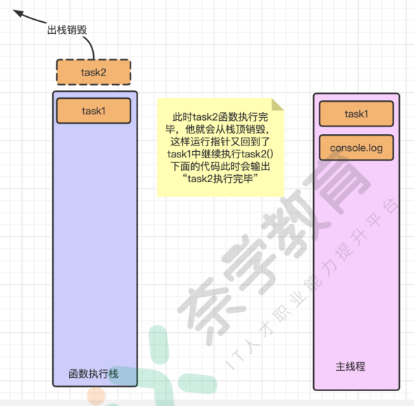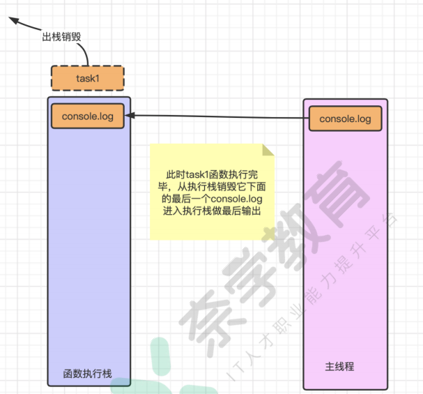 当task1执⾏完毕之后它随着销毁最后⼀⾏输出,就会进⼊执⾏栈执⾏并销毁,销毁之后执⾏栈和主线程清空。这 个过程就会出现123321的这个顺序,⽽且我们在打印输出时,也能通过打印的顺序来理解⼊栈和出栈的顺序和流 程。