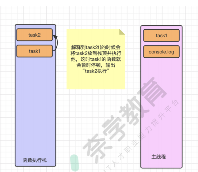 第⼀次执⾏的时候调⽤task1函数执⾏到console.log的时候先进⾏输出,接下来会遇到task2函数的调⽤会出现下⾯ 的情况: