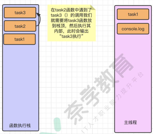 function task1(){ console.log('task1执⾏') task2() console.log('task2执⾏完毕') } function task2(){ console.log('task2执⾏') task3() console.log('task3执⾏完毕') } function task3(){ console.log('task3执⾏') } task1() console.log('task1执⾏完毕')