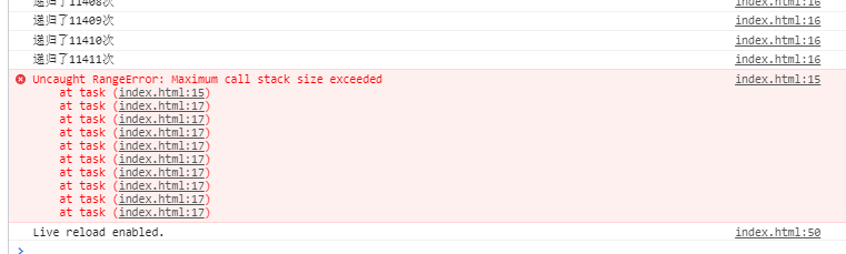 var i = 0; function task(){ i++ console.log(`递归了${i}次`) task() } task()