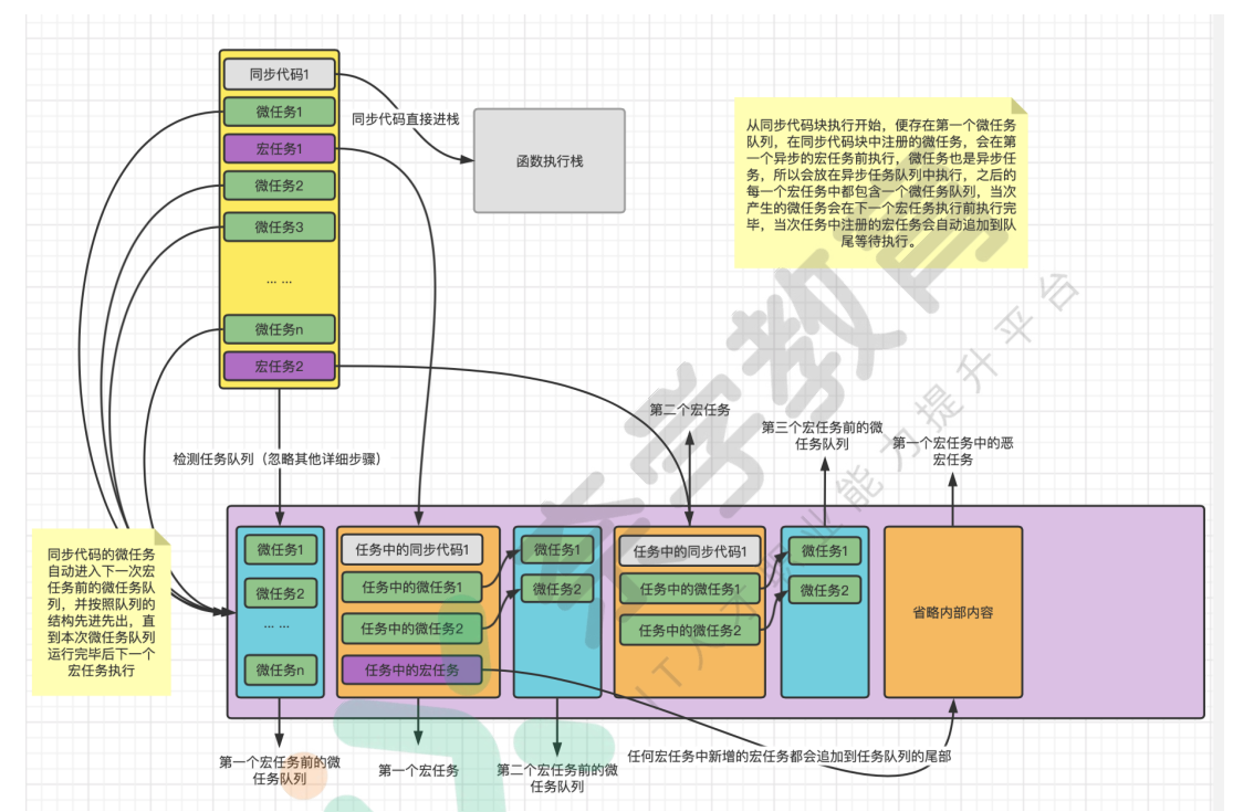 微任务是随着ECMA标准升级提出的新的异步任务,微任务在异步任务队列的基础上增加了【微任务】的概念,每 ⼀个宏任务执⾏前,程序会先检测中是否有当次事件循环未执⾏的微任务,优先清空本次的微任务后,再执⾏下⼀ 个宏任务,每⼀个宏任务内部可注册当次任务的微任务队列,再下⼀个宏任务执⾏前运⾏,微任务也是按照进⼊队 列的顺序执⾏的。