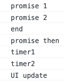 async function async1() { console.log("async1 start") await async2() setTimeout(() => {console.log("setTimeout2")}) console.log("async1 end") } async function async2() { setTimeout(() => {console.log("setTimeout1")}) } console.log('script start') setTimeout(function () { console .log('setTimeout') }) async1() new Promise((resolve) => { console.log("promise1") resolve() }).then(function() { console.log("promise2") }) console.log('script end')