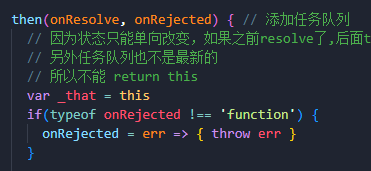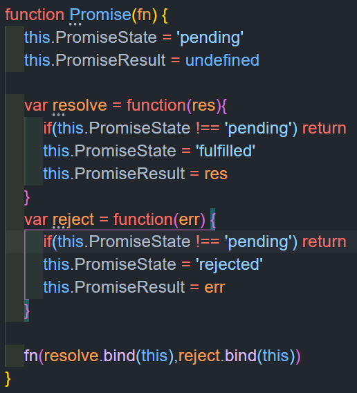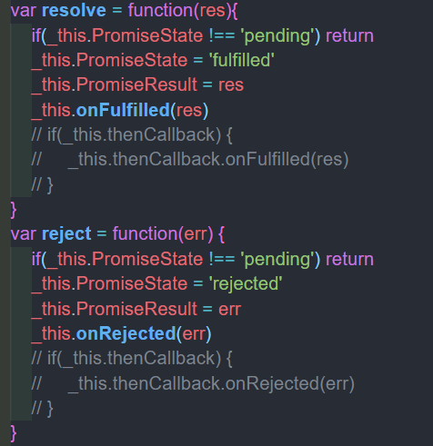 1 var resolve = function(res){ 2 if(_this.PromiseState !== 'pending') return 3 _this.PromiseState = 'fulfilled' 4 _this.PromiseResult = res 5 if(_this.thenCallback) { 6 _this.thenCallback.onFulfilled(res) 7 } 8 } 9 var reject = function(err) { 10 if(_this.PromiseState !== 'pending') return 11 _this.PromiseState = 'rejected' 12 _this.PromiseResult = err 13 if(_this.thenCallback) { 14 _this.thenCallback.onRejected(err) 15 } 16 }