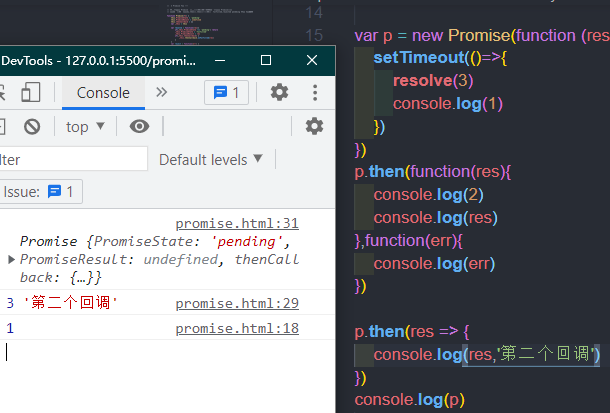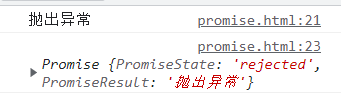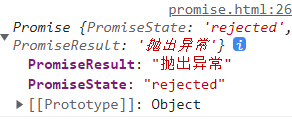var p = new Promise(function (resolve, reject) { throw('抛出异常') }) p.then(function(res){ console.log(res) },function(err){ console.log(err) }) console.log(p)