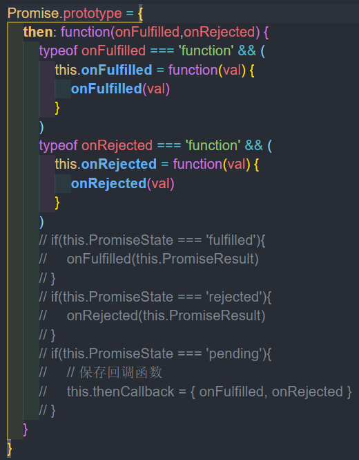 Promise.prototype = { then: function(onFulfilled,onRejected) { if(this.PromiseState === 'fulfilled'){ onFulfilled(this.PromiseResult) } if(this.PromiseState === 'rejected'){ onRejected(this.PromiseResult) } } }