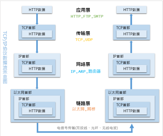当你输入一个网址并按下回车键的时候,首先,应用层协议对该请求包做了格式定义;紧接着传输层协议加上了双方的端口号,确认了双方通信的应用程序;然后网络协议加上了双方的IP地址,确认了双方的网络位置;最后链路层协议加上了双方的MAC地址,确认了双方的物理位置,同时将数据进行分组,形成数据帧,采用广播方式,通过传输介质发送给对方主机。而对于不同网段,该数据包首先会转发给网关路由器,经过多次转发后,最终被发送到目标主机。目标机接收到数据包后,采用对应的协议,对帧数据进行组装,然后再通过一层一层的协议进行解析,最终被应用层的协议解析并交给服务器处理。