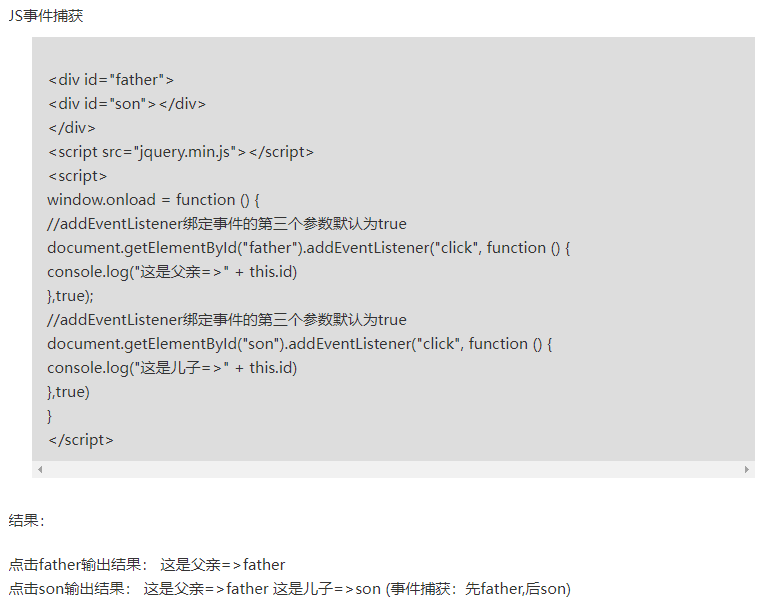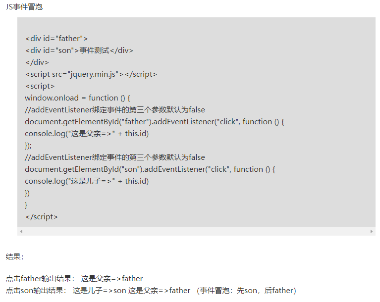 1.当点击son元素时,先触发father的点击事件,再触发son的点击事件,打印相应的内容;
